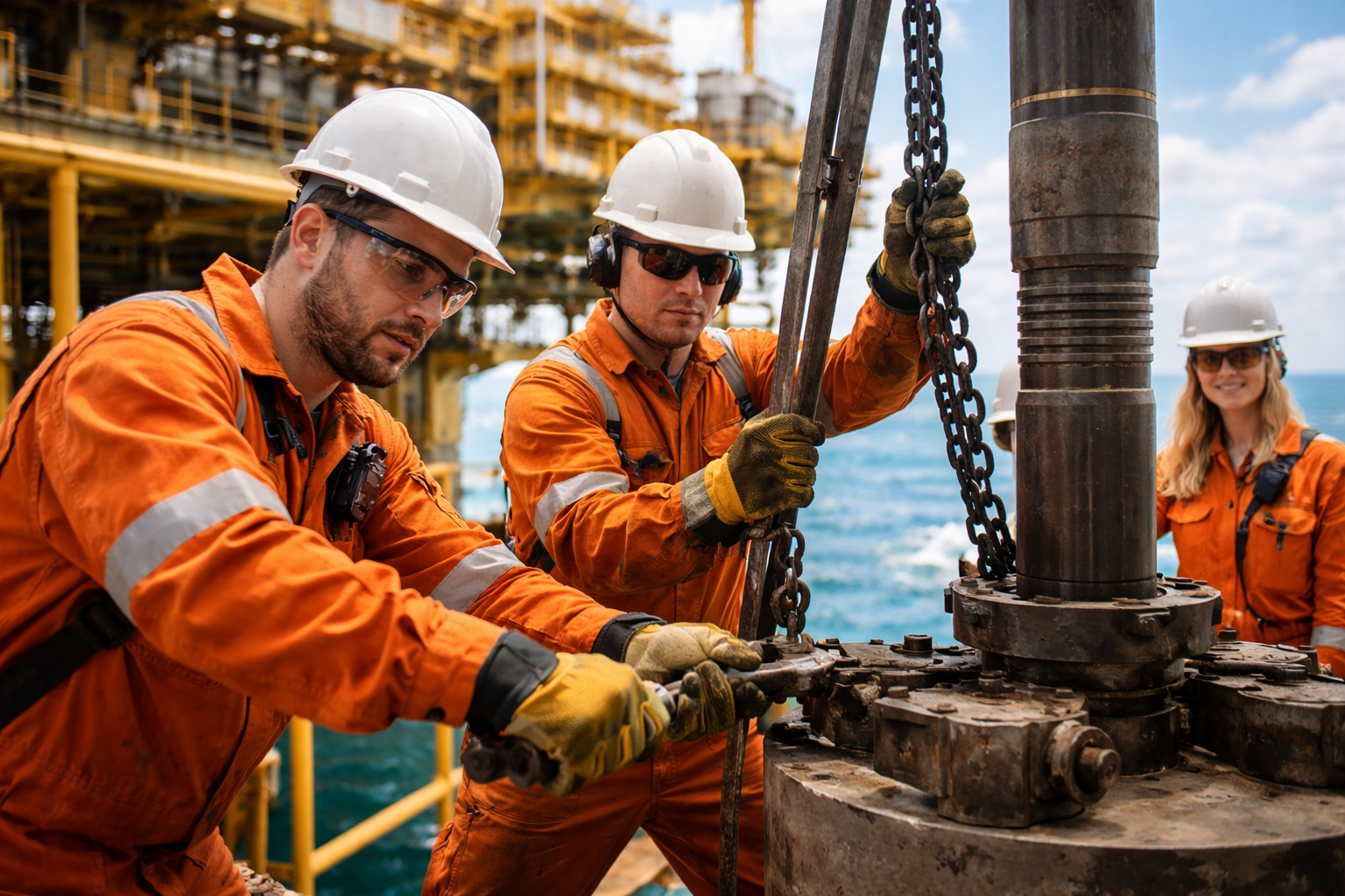 Industrial operations, environmental safety, teamwork, oil extraction, maritime logistics.